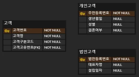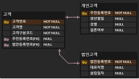 고객의 주민등록번호(FK), 법인등록번호(FK) null 허용, 둘 중 하나의 값만 존재해야 한다. 고객의 유형이 추가되면 고객 테이블에 컬럼이 추가되어야 한다. 조회 요건을 복잡하게 만들어서 실무에서 잘 사용되지 않는다.