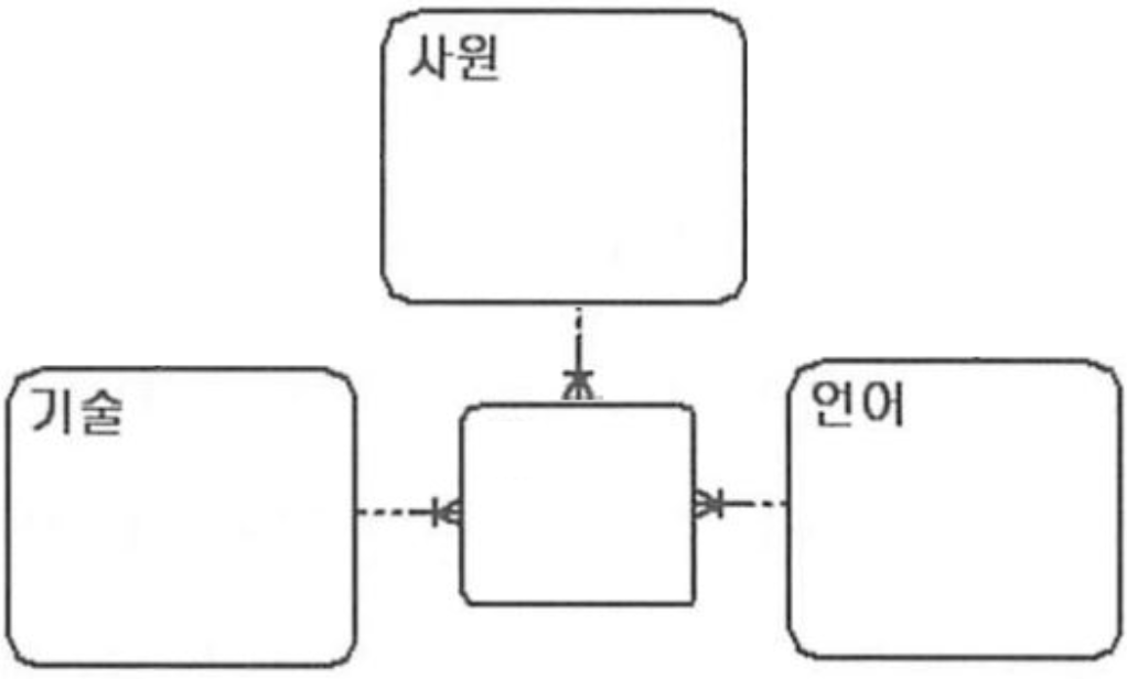 그림(4)에서 보는 것처럼 제4정규형과 제5정규형은 비슷하다. [4정규형]에서 A, B가 엔터티이고 [5정규형]에서 A, B, C가 엔터티이다. [4정규형]은 기술과 언어의 연관되지 않지만 [5정규형]은 기술과 언어가 연관 관계가 존재하므로 C엔터티가 필요하다. 그림(2) 릴레이션처럼 되는 것이다.