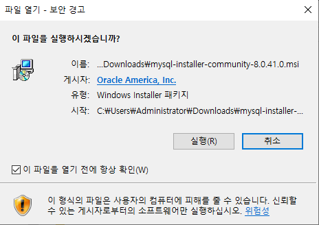 컴퓨터에 다운로드한 파일 "mysql-installer-community-8.0.41.0.msi" 을 실행하자.