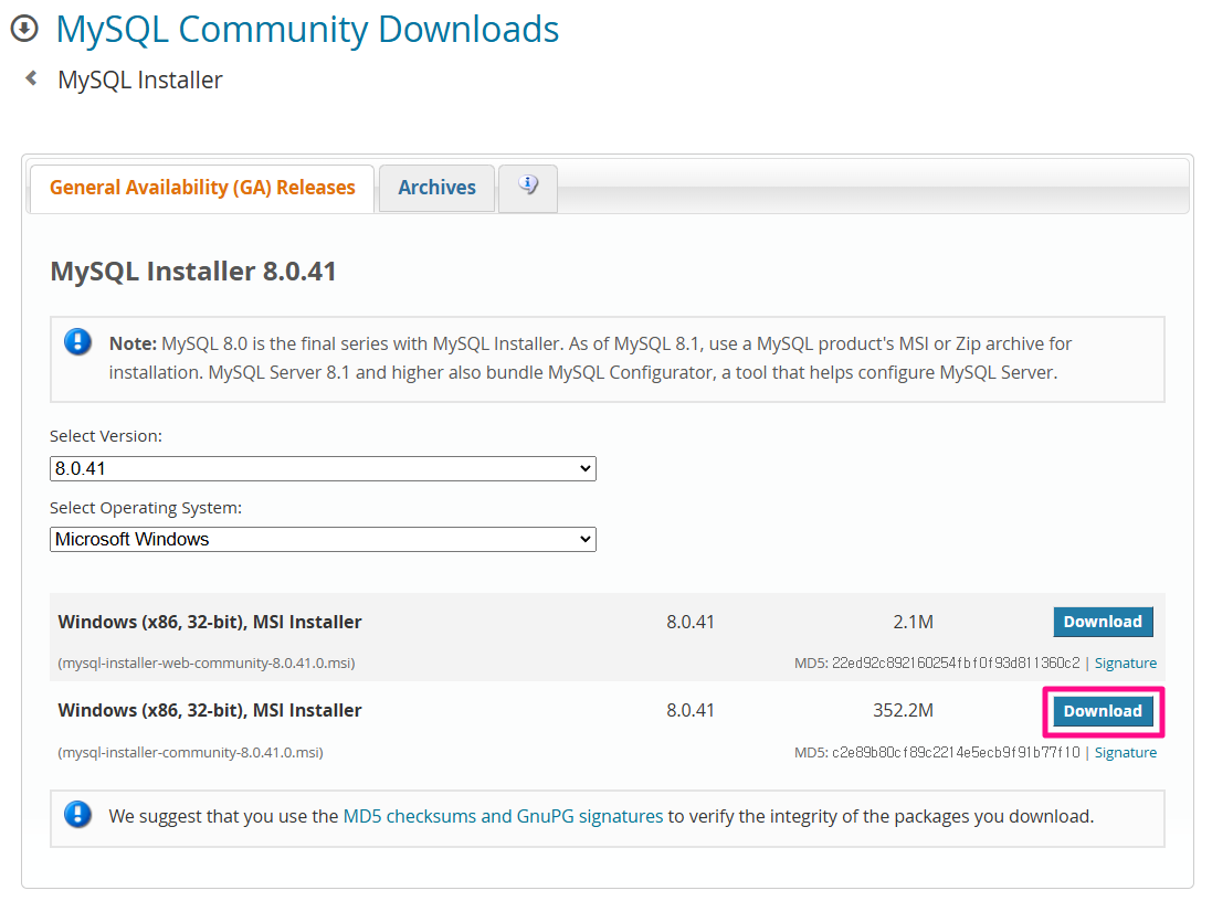위 화면이 나타나면 "MySQL Installer for Windows" 링크를 클릭한다.