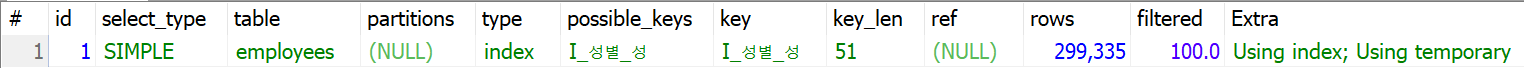 gender 컬럼은 NOT NULL이기 때문에 애초에 null값이 있을 수 없었음. 쓸데없는 작업이 추가되면서 임시 테이블을 사용하게 되었음. Extra 컬럼에 Using temporary가 표시됨