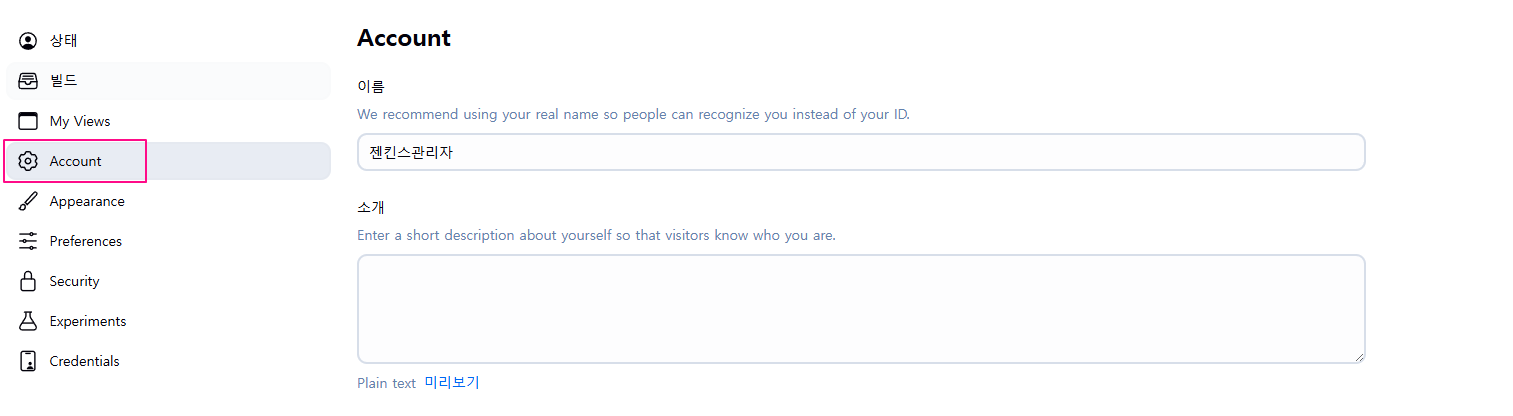 Left Menu에서 Account 메뉴 선택, 스크롤을 아래로 내리면
