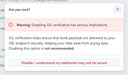 모달창 나타나면 [ Disable, I understand my webhooks may not be secure ] 선택